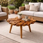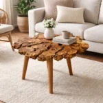 A unique handcrafted coffee table made from premium olive wood, featuring a natural live edge design that highlights the beauty of the wood’s rich grain and organic shape. Each piece is one of a kind, adding warmth and character to any space.